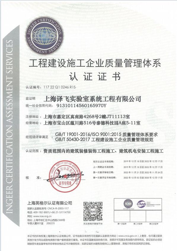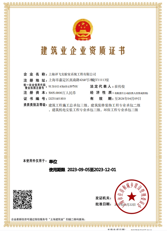 资质范围:建筑装修装饰工程施工、建筑机电安装工程施工,实验室设备销售